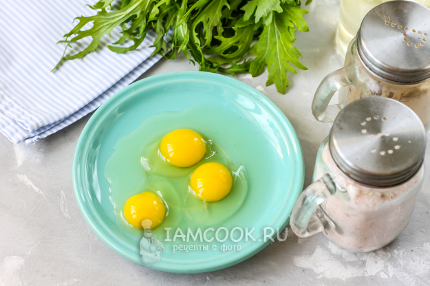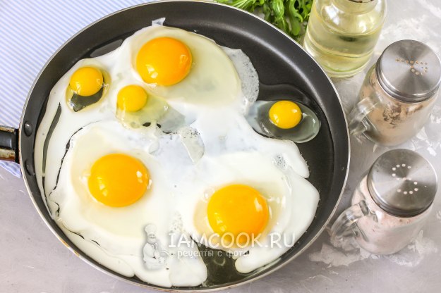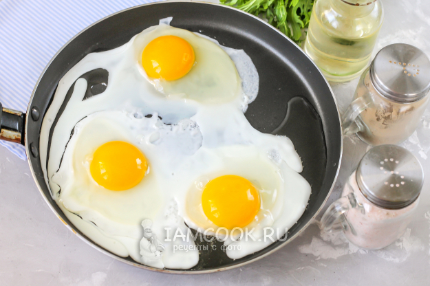Влейте или смажьте маслом сковороду, прогрейте ее на плите. Вбейте на нее куриные яйца и прожарьте их на умеренном нагреве примерно 3 минуты. Снизу белок должен схватиться.