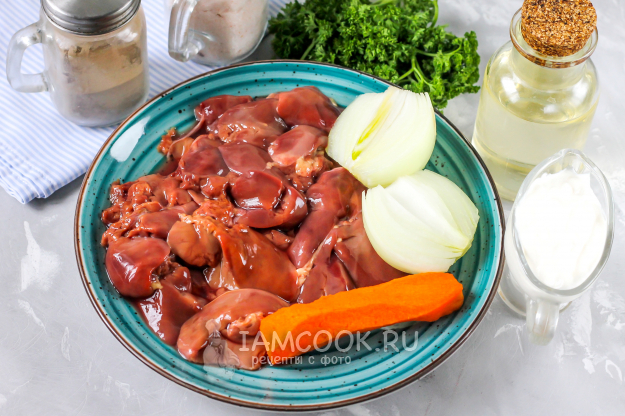 Подготовьте необходимые ингредиенты для приготовления куриной печени в сметанном соусе и начнем кулинарить!