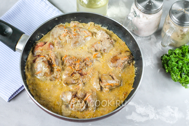 Накройте сковороду крышкой и томите куриную печень в сметанном соусе примерно 5-6 минут.