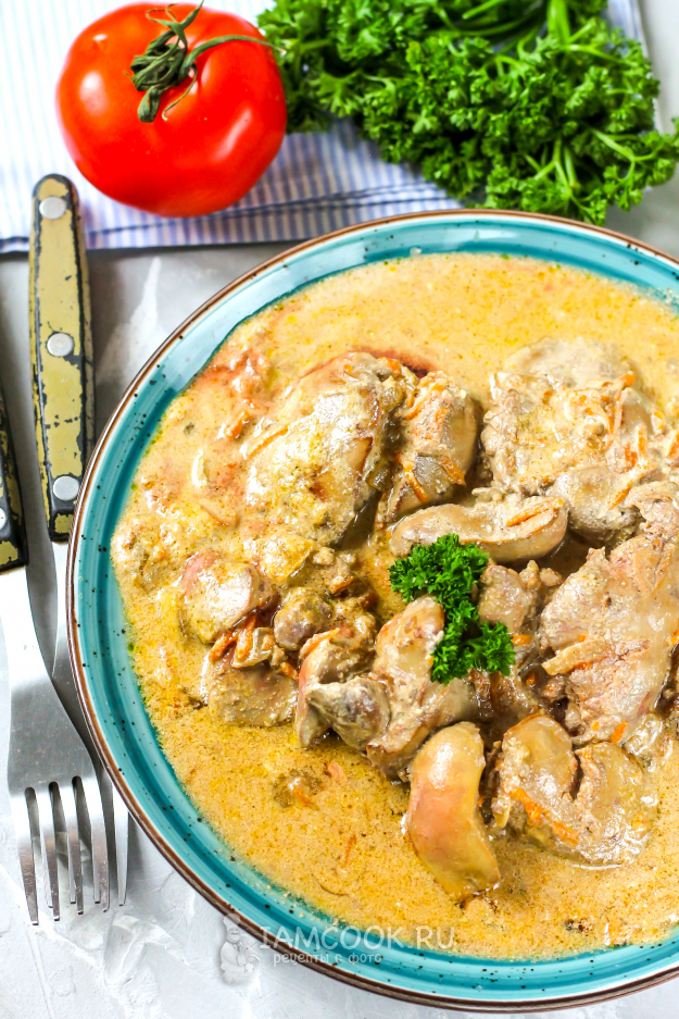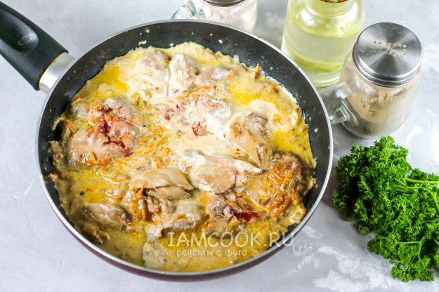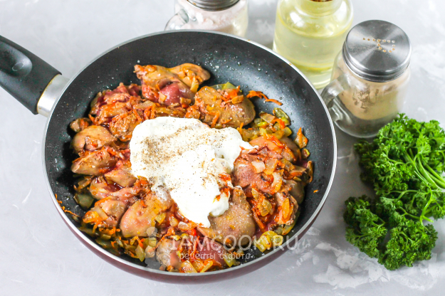 Обжарьте около 5-6 минут, переворачивая субпродукт и на другую сторону. Затем добавьте сметану любой жирности, соль и молотый черный перец.