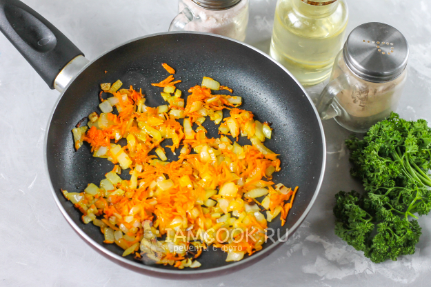 Лук и морковь очистите от кожуры, промойте в воде. Натрите морковь на терке с мелкими ячейками, а лук нарежьте мелким кубиком или полукольцами. Прогрейте на сковороде растительное масло и выложите в него овощные нарезки. Обжарьте до румяности примерно 3-4 минуты.