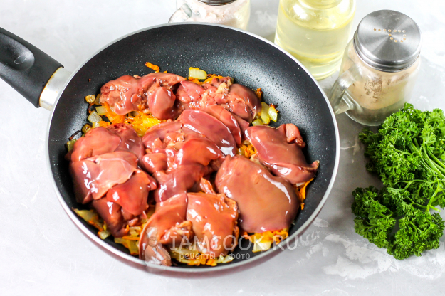 Промойте куриную печень, вырежьте желчные протоки, слегка обсушите бумажным полотенцем и выложите на сковороду.