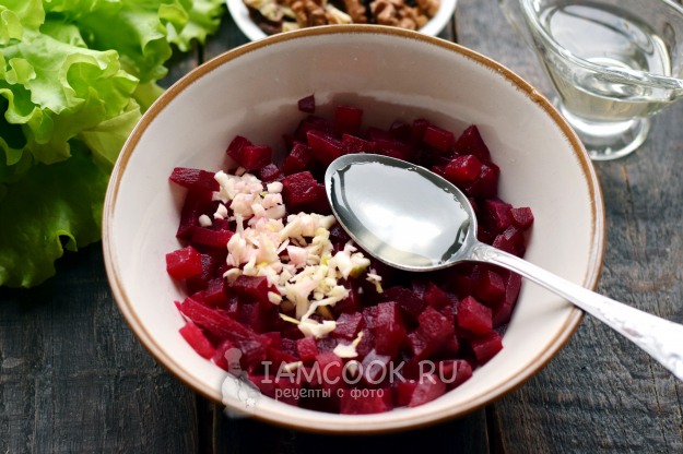 Заправьте свеклу маслом и соком лимона, добавьте измельченный чеснок, хорошо перемешайте.