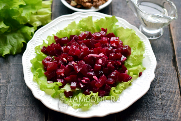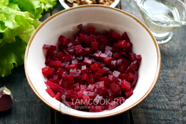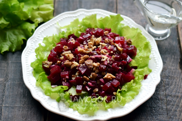 Орехи нарежьте ножом на кусочки разных размеров, присыпьте ими свеклу.