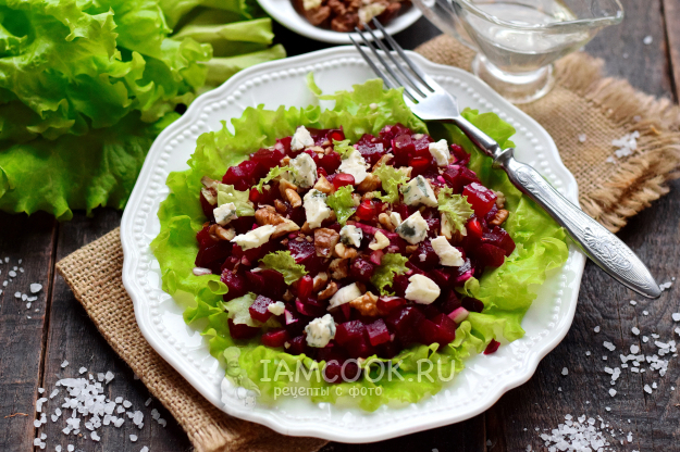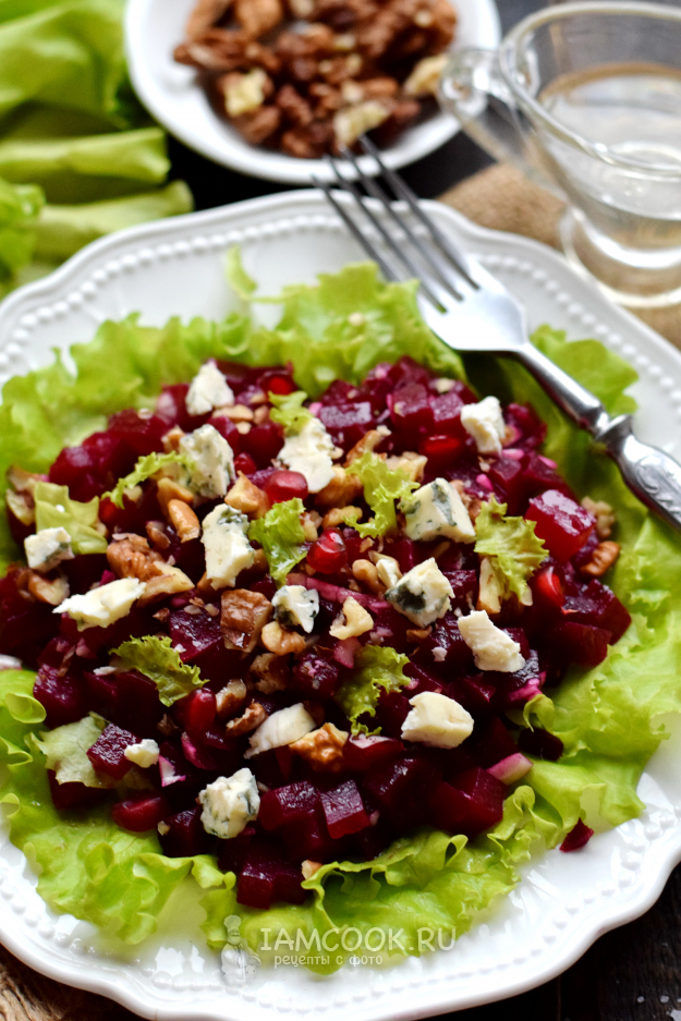 При желании присыпьте зернами граната. Салат со свеклой и сыром Дор Блю готов к подаче.