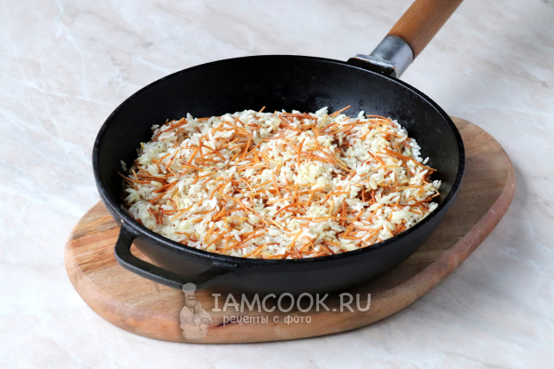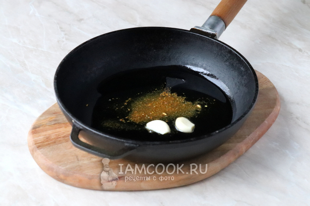 На разогретую с растительным маслом сковороду выложите очищенный чеснок, разрезав его пополам, и щепотку приправы для риса. Прогрейте специи 1 минуту и уберите чеснок (он нам больше не понадобится).