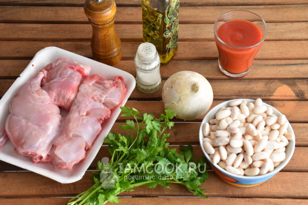 Для приготовления кролика с фасолью в томатном соусе необходимо приготовить следующие ингредиенты.