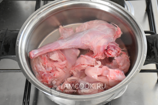Тушку кролика разрезать на крупные куски, положить в кастрюлю, залить холодной водой, посолить, довести до кипения и варить 20 минут.