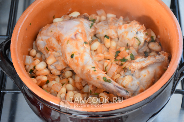В керамическую кастрюлю выложить фасоль, кролика, лук, накрыть крышкой и томить на слабом огне 50 минут. При необходимости подлить воду или бульон.