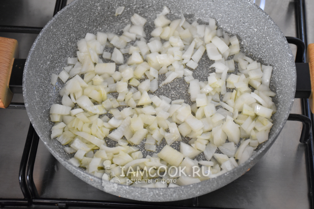 Лук крупно нарезать. В сковороде разогреть оливковое масло и обжарить лук до мягкости.
