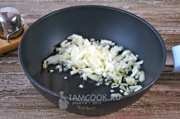 Пока картошка варится, обжарьте на сковороде с растительным маслом рубленый лук до мягкости.