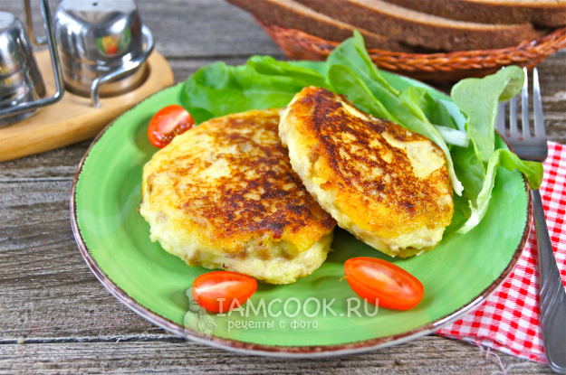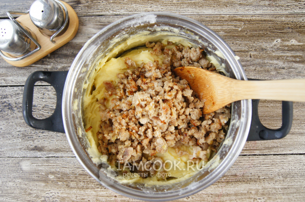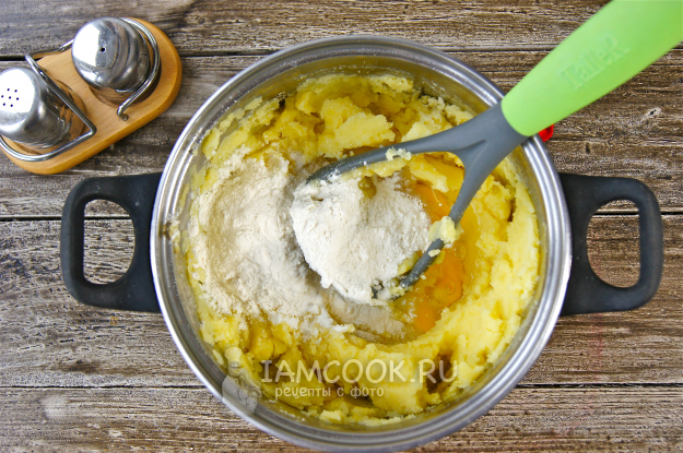 Как только картофель сварится, слейте воду и разомните толкушкой в пюре, остудите, добавьте яйцо и муку, перемешайте.
