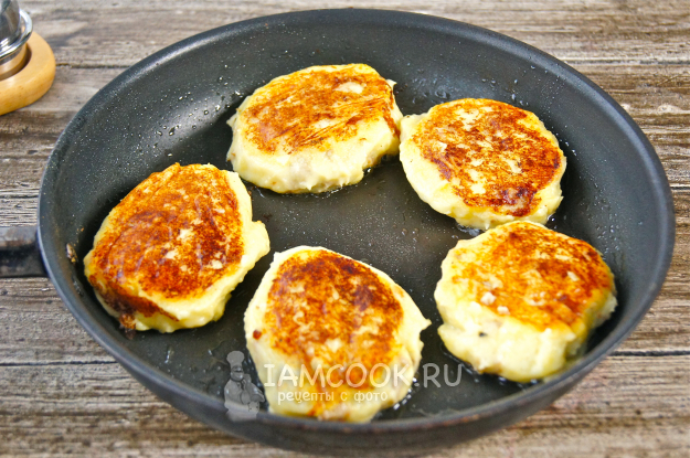 Из картофельной массы слепите бульбяники нужного размера, выложите на разогретую сковороду с растительным или сливочным маслом.