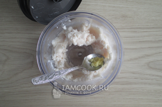Вмешайте соль и измельченный чеснок в перемолотое сало.