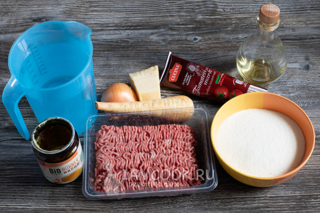 Подготовить ингредиенты для поленты с фаршем, а также огнеупорную форму. Пусть цвет моей муки для поленты вас не смущает - она просто сделана из белой кукурузы.