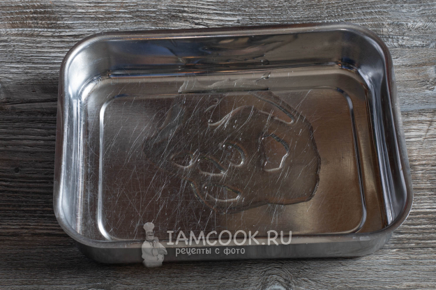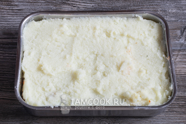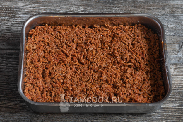 Выкладываем на дно формы слой из половины поленты, поверх него - слой из обжаренного фарша.