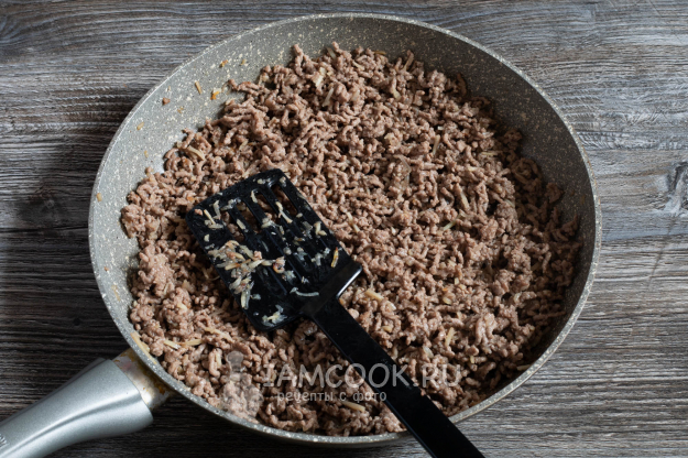 Подмешиваем к овощам фарш и обжариваем его до потери розового цвета.