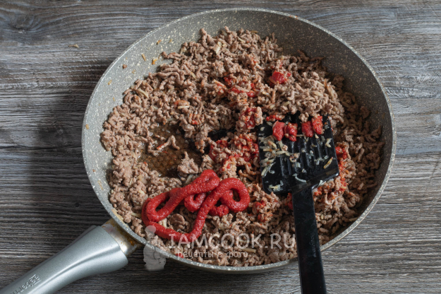 Добавляем томатную пасту и соль, размешиваем до однородности.