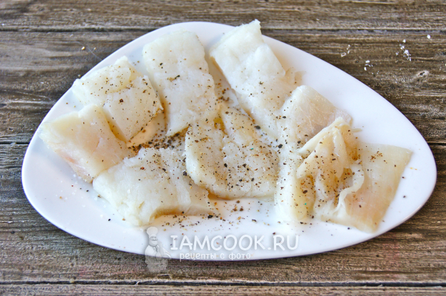 Филе трески нарежьте на средние куски, посолите и поперчите со всех сторон.