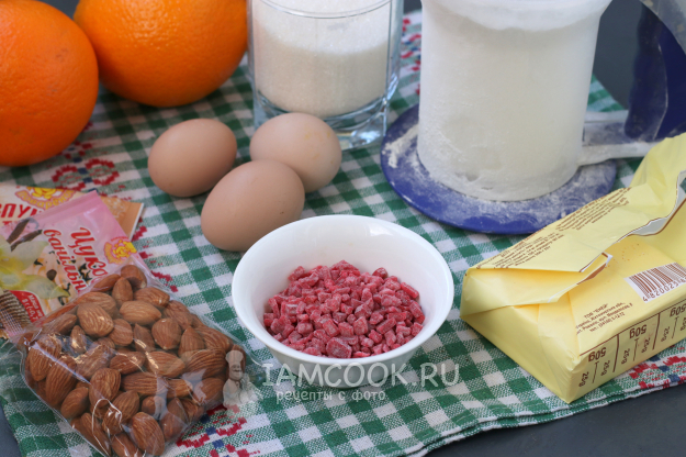 Подготовить из списка необходимые ингредиенты для приготовления апельсинового кекса с миндалём и цукатами. Все продукты должны быть комнатной температуры. Цукаты лучше брать мелкие, для более равномерного распределения их в тесте.