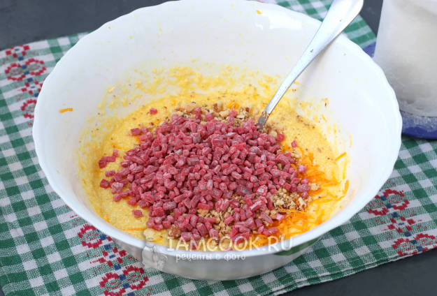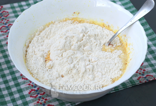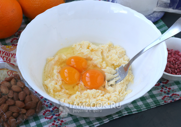 Добавить в эту смесь яйца и хорошо перемешать, взбивать не нужно.