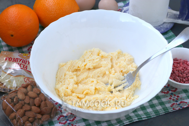 Добавить в тесто цедру, миндаль и цукаты, влить сок. Всё хорошенько перемешать.
