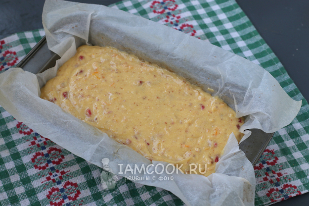 Застелить пергаментом форму и вылить тесто. У меня - прямоугольная форма 9 на 20 см. Можно выпекать и в круглой с диаметром 18-20 см.
