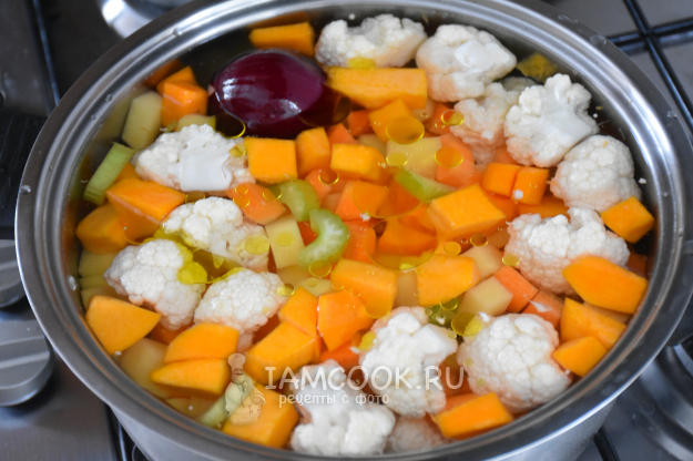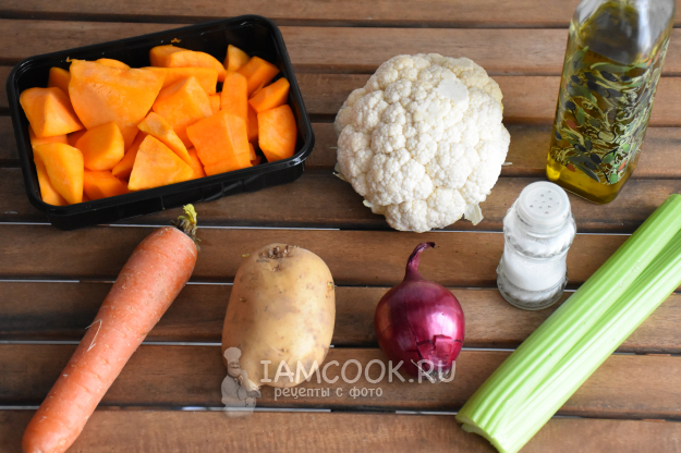 Для приготовления супа из тыквы и цветной капусты необходимо взять следующие ингредиенты.