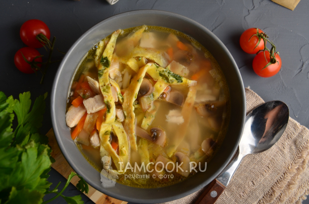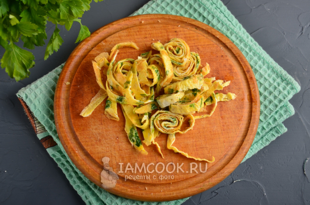 Взбейте яйцо со шпинатом и щепоткой соли, пожарьте на растительном масле тонкий яичный блинчик. Остудите его и нарежьте полосками. Далее положите его в кастрюлю с почти готовым супом.