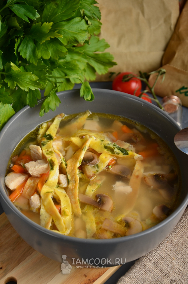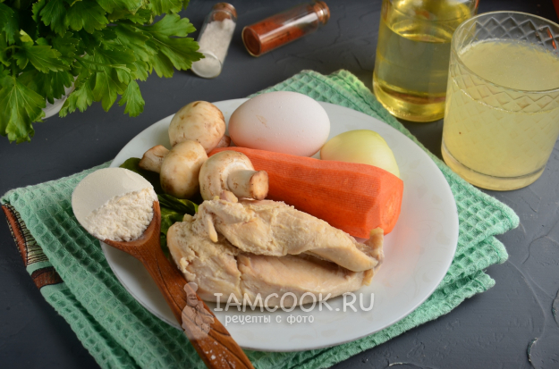 Подготовьте необходимые продукты для итальянского куриного супа. Куриное филе нужно заранее сварить в подсоленной воде со специями и пряностями. Вместо филе подойдет и красное куриное мясо. Лук и морковь почистите, помойте вместе с грибами. Отмерьте немного пшеничной муки для зажарки.