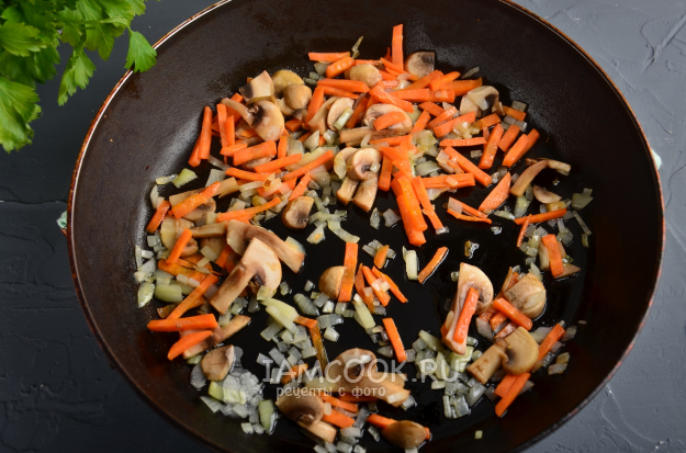 На сковороде разогрейте рафинированное масло, выложите одновременно лук, морковь и грибы. Помешивая, обжаривайте 4-5 минут на тихом огне. Затем смешайте с мукой и обжаривайте еще минуту.