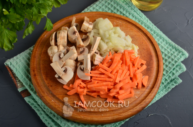 Лук мелко нарежьте, морковь порубите тонкой соломкой, а грибы нарежьте пластинками.