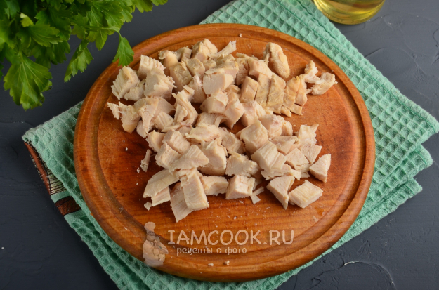 Вареное куриное мясо остудите и нарежьте на небольшие кусочки.