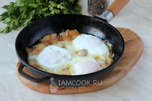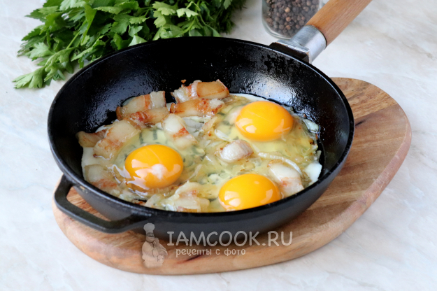 Жарьте его до румяного цвета, периодически помешивая, около 5 минут. За это время в сковороде появится достаточное количество вытопленного жира, на котором мы и будем жарить яйца, поэтому растительное масло добавлять не нужно.