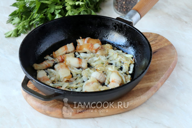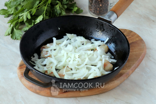 Крупную головку репчатого лука очистите и нарежьте полукольцами. Подготовленную нарезку переложите к салу и жарьте, периодически помешивая, также 5 минут.