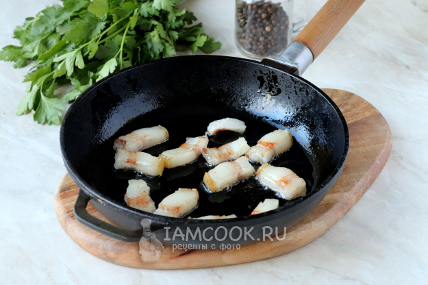Свежее свиное сало, желательно с мясной прослойкой, нарежьте средними брусочками и выложите на сухую, хорошо разогретую сковороду.