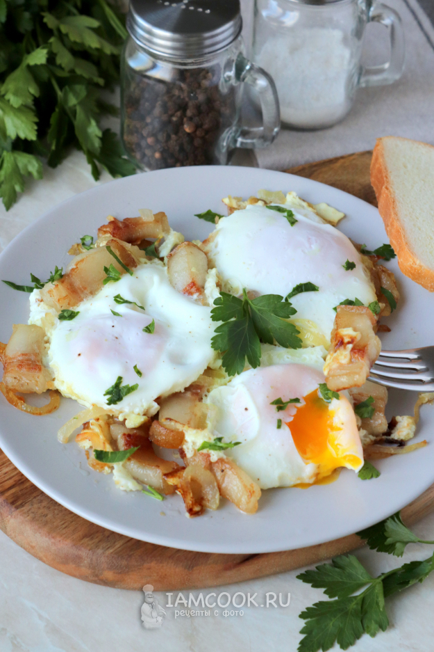 Зажарку посолите и поверх неё аккуратно, чтобы не повредить желток, вбейте куриные яйца. Чтобы быть полностью уверенным, что яйца хорошие, и тем самым не испортить блюдо, можно сначала разбить их в небольшую мисочку, а затем переложить на сковороду.