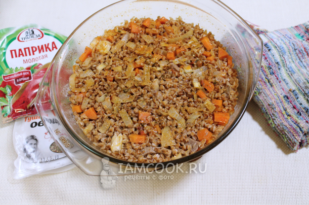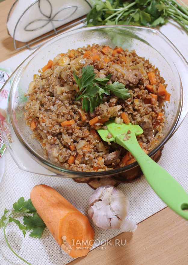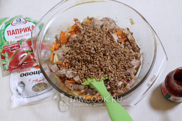 Возьмите продукты для приготовления гречки по-купечески с индейкой в микроволновке.