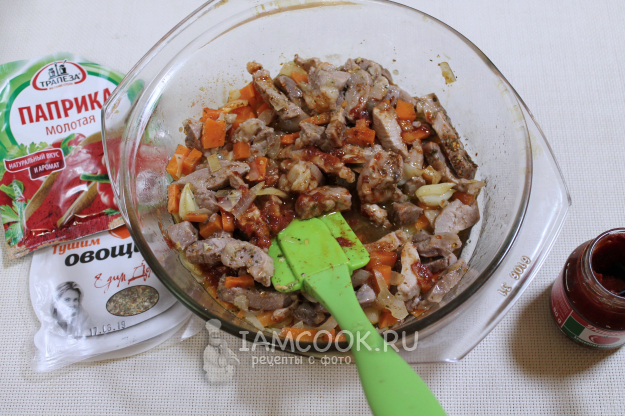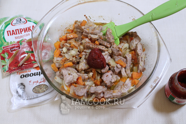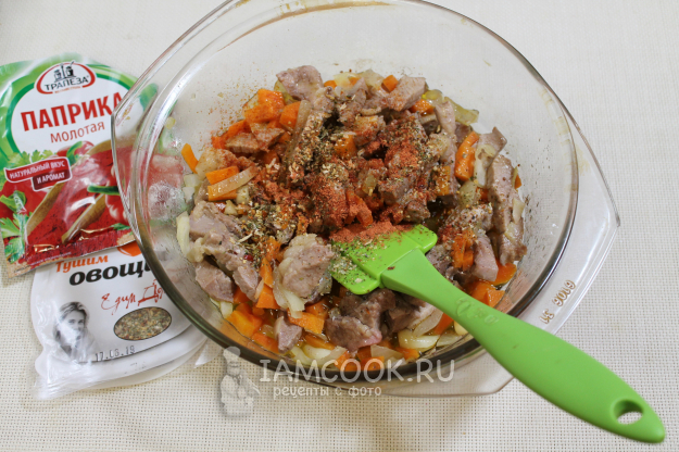 Кастрюлю выньте, добавьте сухую пряную смесь для тушения овощей и молотую паприку.
