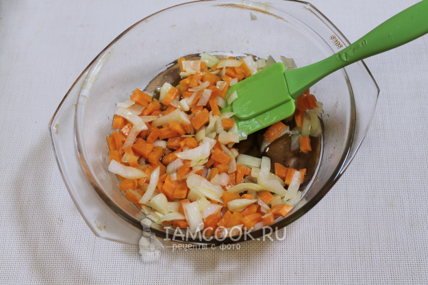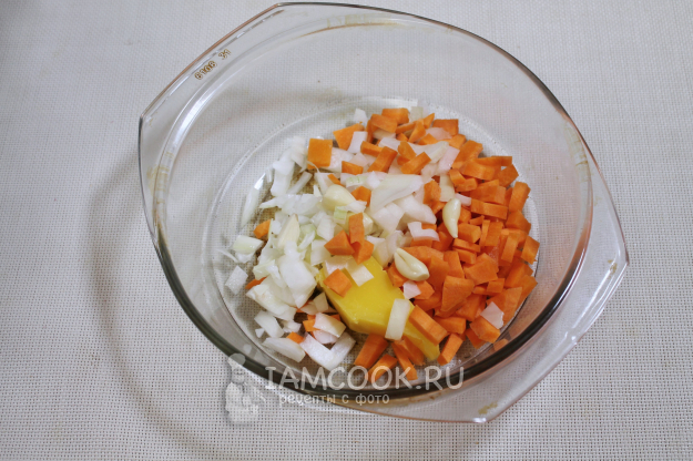 Сложите в емкость для микроволновой печи топленое сливочное масло и нарезанные овощи.