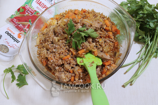 Влейте стакан воды, перемешайте и варите гречку с индейкой по-купечески в микроволновке минут 10 до готовности. Крышкой во избежание выплескивания воды я не прикрывала.