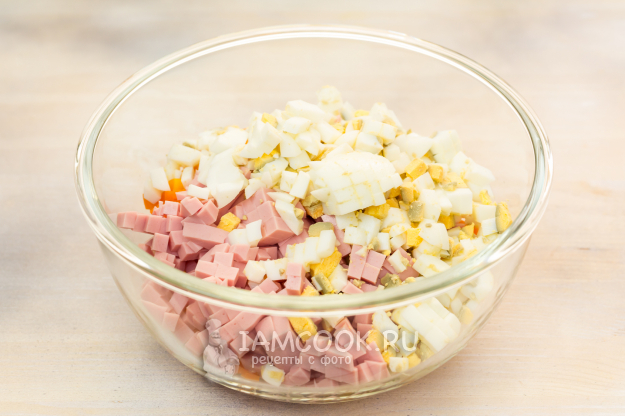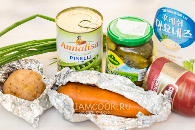 Подготовьте продукты для салата «Столичный» с колбасой и маринованными огурцами по списку ингредиентов. Овощи заранее отварите или запеките. Яйца также отварите и остудите полностью.