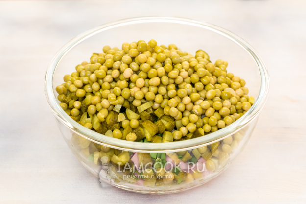 Добавьте нарезанные маринованные огурцы, зеленый лук и горошек.