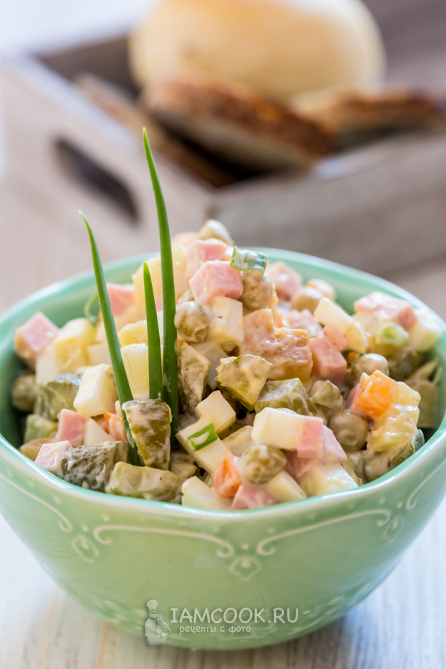 Салат «Столичный» с колбасой и маринованными огурцами готов. Подавайте тут же.