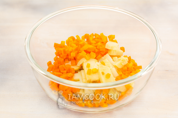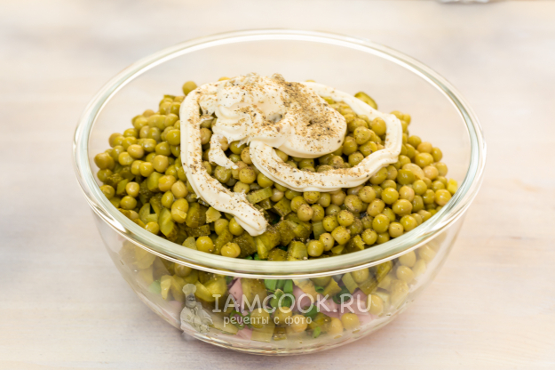 Приправьте солью и перцем. Добавьте майонез. Перемешайте.