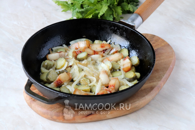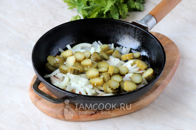 Ингредиенты для приготовления яичницы с солеными огурцами.