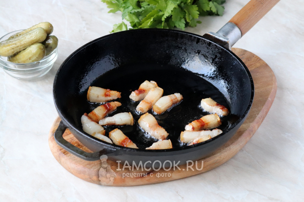 Периодически помешивая, жарьте сало около 5 минут, до румяного цвета и достаточного выделения жира.