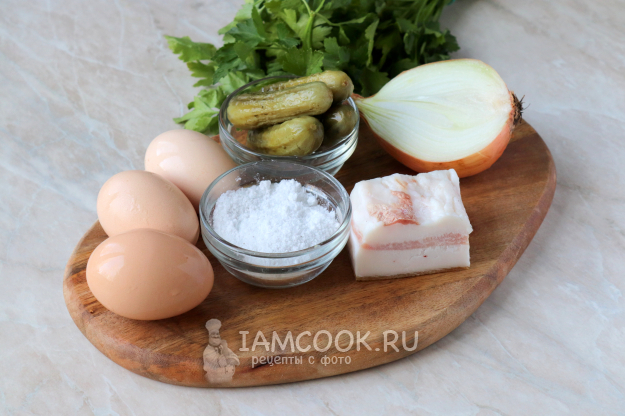 Тем временем очистите и нарежьте лук полукольцами, соленые огурцы - кружочками средней толщины (как на фото). Подготовленную нарезку выложите к салу.