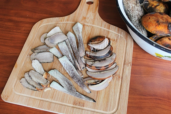Сушить грибы можно кусочками любого размера или даже целыми, только время будет разным. Предлагаю нарезать ножки и шляпки грибов на пластинки толщиной около 5 мм.