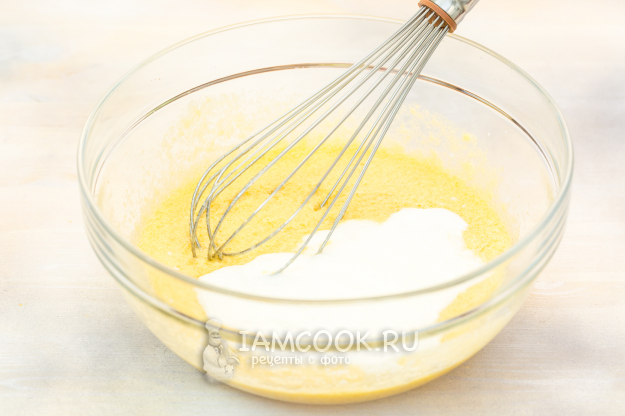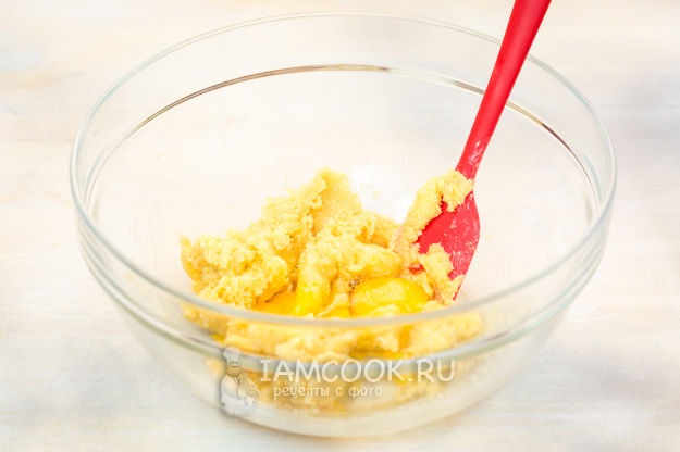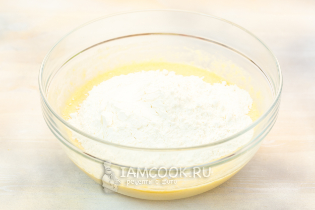 Добавьте муку, смешанную с разрыхлителем. Перемешайте.